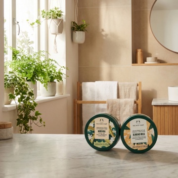 清新自然的浴室场景,轻拟物风设计融合粒子水珠效果,营造柔和清爽感,实景质感突出产品舒适体验。