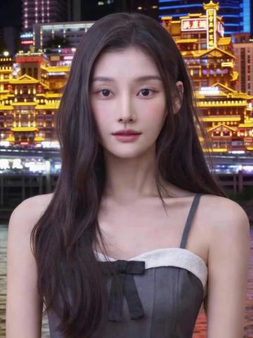 国潮风与都市夜景交融,传统服饰邂逅现代地标,红灯笼与霓虹光影交织,女孩和李白合影,实景感十足的喜庆氛围中透出浓厚的国庆节民族情愫。