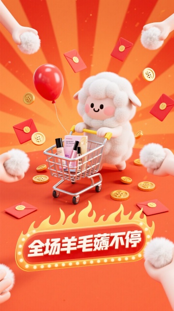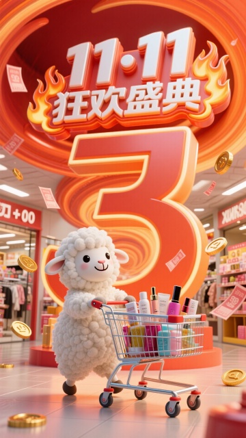 3D卡通风格。一个商场,一个毛茸茸的白色可爱小羊,面带微笑推着购物车,购物车里有美妆产品和日用品。主标题立体字“11·11”显店铺顶部,副标题火焰边框设计的立体文字“狂欢盛典”。周围飘着优惠券和金币。背景是节日氛围的漩涡,明亮的红橙色。