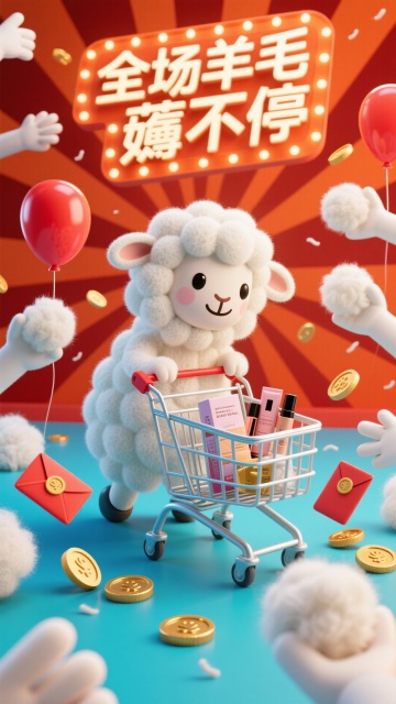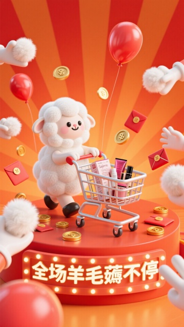 软3D风可爱小羊推购物车,拟人化设计满载商品,霓虹灯风店铺招牌闪耀“11·11狂欢盛典”,金币与优惠券飞舞,营造喜庆促销氛围。