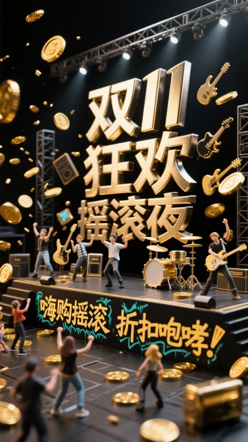3D微缩艺术风,鎏金金属质感,舞台摇滚元素与金币飞舞,营造酷炫促销氛围,综艺感十足,双11狂欢夜主题鲜明。