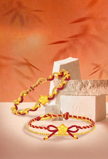 黄金吊坠产品为主体,在一块乌木上,周围放着很多金色枫叶,远处是热带雨林和树的粗支,背景模糊,整体氛围暗色神秘