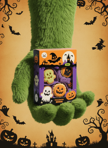 一只毛茸茸的雪怪(白色毛+蓝色掌心)的手托着主体,紫色背景,边缘点缀橙色剪影风格的万圣节元素:南瓜灯、幽灵、蝙蝠、女巫剪影、城堡和扭曲的树木