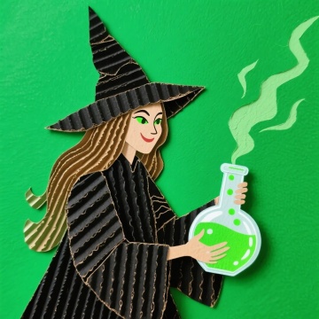 4 个万圣节元素,上下两行整齐排列,分别是:长着翅膀的幽灵、一只棕熊倚靠在墓碑旁、蝙蝠形状的钟表、女巫骑着扫帚,绿色背景