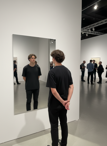 在一个简约的白色艺术展厅里,人物背对镜头站立,旁边墙上挂着一幅风格写实的大油画,油画正对镜头 画中人物形象与该人物呼应,画面有射灯营造的艺术氛围,整体呈现出艺术展览中‘人物与自画像’的创意场景,色调偏写实自然