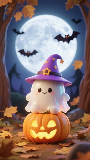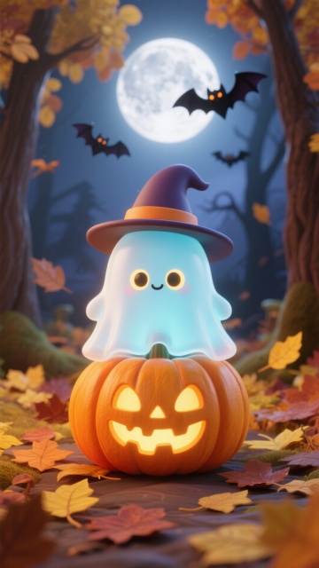 软3D风可爱鬼魂戴巫师帽,坐于发光南瓜上,秋叶飘落,月夜蝙蝠飞舞,拟人化设计营造梦幻温馨的万圣节氛围。