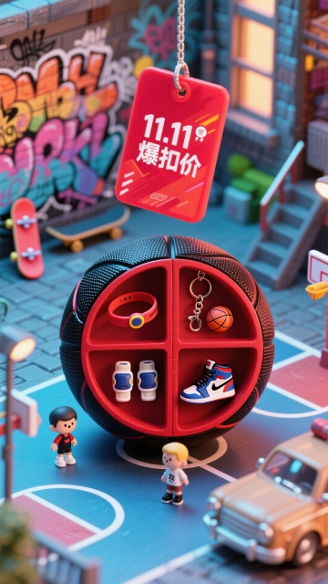 潮流感十足的微缩艺术场景,3D风篮球收纳盒内藏潮品,搭配霓虹灯效与卡通人物,营造出充满促销氛围的11.11购物狂欢节。