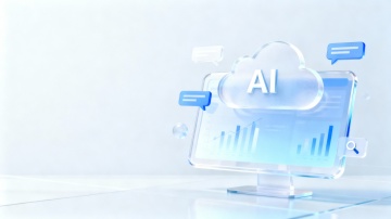 未来感与科技感交织的3D玻璃风设计,清透几何线条环绕AI云图标,光影流动凸显体积感,虚拟现实氛围中展现简约主义美学。