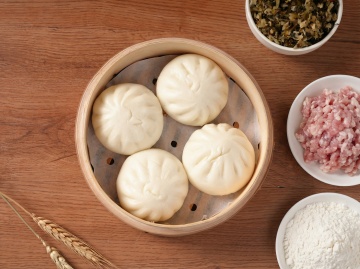 中式感十足的蒸饺跃出竹笼,重拟物风结合浮雕质感,光影交错中展现实景动态,节日氛围浓郁。