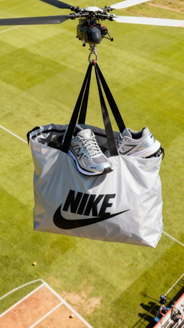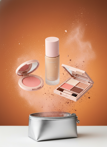 未来感与科技感交织,无人机悬吊鎏金购物袋,内含奢华护肤产品,3D重拟物风格呈现金属质感,时尚都市背景尽显高端品牌魅力。