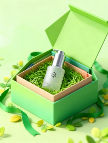 清新绿意中,3D玻璃风瓶身置于草丛礼盒,轻拟物设计融合虚拟自然,简约主义演绎清爽舒适感。