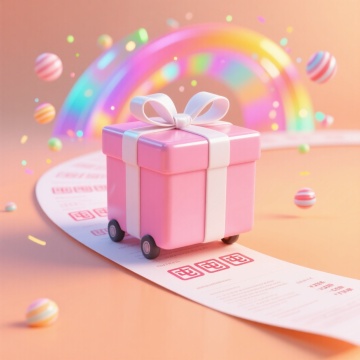 梦幻甜粉礼盒,软3D塑料质感,搭配彩虹与粒子飘散,萌趣可爱风,节日氛围感十足。