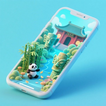 软3D风格的微缩艺术场景,可爱熊猫坐于手机屏幕之上,中式古建筑与青铜面具点缀其间,梦幻蓝调光影营造童话氛围。