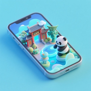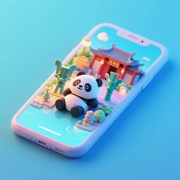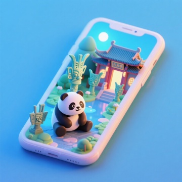 软3D风格的微缩艺术场景,可爱熊猫坐于手机屏幕之上,中式古建筑与青铜面具点缀其间,梦幻蓝调光影营造童话氛围。