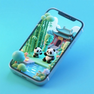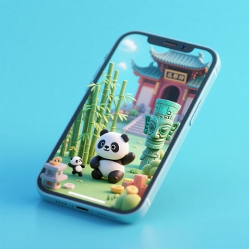 软3D风格的可爱熊猫在手机屏幕中穿梭于中式建筑,融合科技感与趣味感,微缩艺术呈现传统与现代的碰撞。