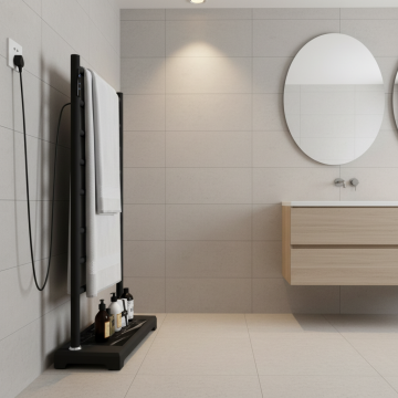 极简主义风格浴室,整体以纯净的白色为主色调,搭配温暖的原木色人字拼地板,营造出明亮、洁净、宁静的氛围。柔和的自然光从画面外洒入,在白色墙面上形成微妙的光影过渡,光线均匀柔和,阴影细节自然。空间布局改为开放式淋浴区与独立式浴缸分区设计,浴缸更换为带有金属支架的椭圆形亚克力材质,置于房间中央位置,旁边增设一个原木色置物架。墙面采用大块哑光瓷砖铺设,局部嵌入浅灰色石质壁龛用于收纳洗漱用品。悬挂式白色洗手台下方设计成开放式储物格,搭配黑色金属水龙头和圆形镜子。天花板安装两盏黑色半球形吊灯,提供主要照明。浴室内摆放简约线条的原木色收纳柜和绿植装饰,毛巾和洗漱用品保持整齐摆放,整体视觉层次分明,信息传达简洁高效,符合现代都市人群对简约生活美学的追求。
