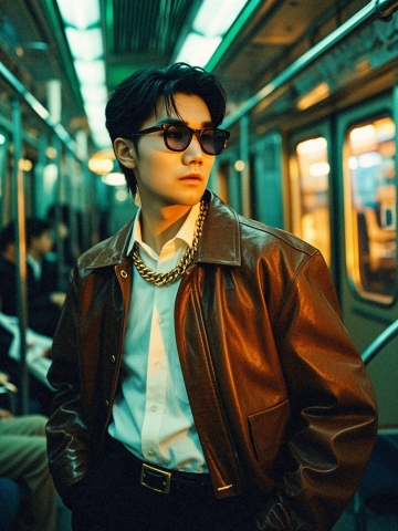 地铁车厢内的人物,身着棕色皮夹克、白衬衫,搭配大金链与墨镜,复古时尚,氛围感拉满。