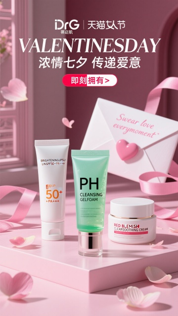 梦幻粉色天空下,软3D风毛绒星云托起面霜,拟人鳄梨与萌兽共舞,充气感字体飘浮,泡泡环绕,甜蜜卡通感满溢,营造童趣爆品节氛围。