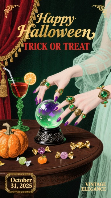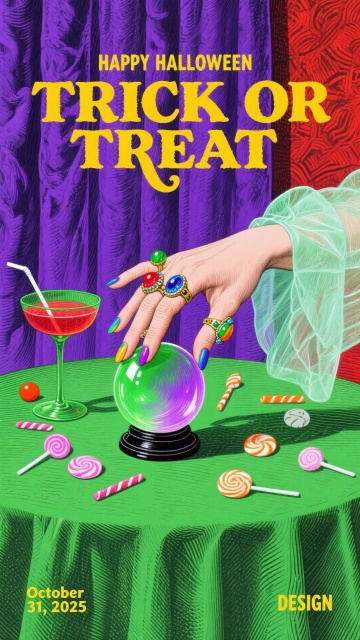 画面中心是一双佩戴多枚戒指、有着创意美甲(彩色图案、渐变色彩)的手,穿着浅绿色透明薄纱服饰,正互动式摆弄一个绿紫渐变的透明水晶球(黑色底座);场景是绿色桌面,散落着彩色棒棒糖(粉、橙、白等),左侧有一只绿色高脚杯盛着红色鸡尾酒(插着白色吸管、点缀圆形糖球);背景是紫色丝绒质感的窗帘。画面色彩以亮绿、紫、红为主,呈现复古胶片的色调风格。顶部有黄色 “HAPPY HALLOWEEN”,下方大号黄色复古字体 “TRICK OR TREAT”,左下角 “October 31, 2025”,右下角 “DESIGN”,整体构图聚焦手部与奇幻道具,营造复古万圣节的神秘趣味氛围