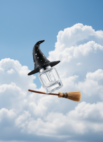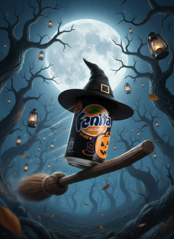 主体瓶盖戴着红灰相间的巫师帽,放置在悬浮木质扫帚上,在橙色背景前 “飞行”,旁边点缀黑色的卡通树插画