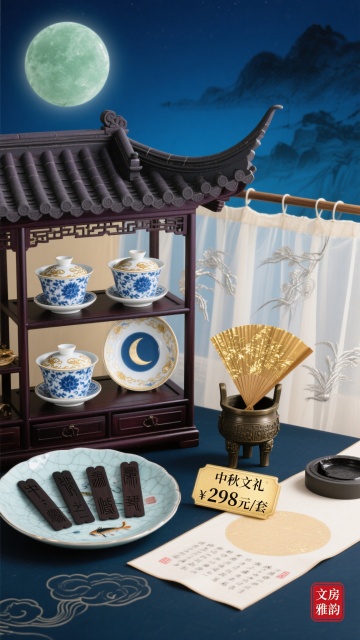 竖版构图,中秋高端礼盒主视觉海报,整体采用霁蓝与鎏金渐变色调,背景为流动的祥云托举着一轮满月的工笔意境,月光如水银倾泻而下。画面中央是双层六角形提篮礼盒,上层以螺钿工艺镶嵌玉兔捣药图案,下层浮雕缠枝莲纹,礼盒正面悬挂着写有"中秋雅韵"的洒金红绸吊牌,礼盒置于雕花紫檀木座上,木座旁散落着几颗晶莹的露珠。前景为青瓷碟中摆放的广式莲蓉月饼、苏式鲜肉月饼和一盏燃着檀香的三足铜炉,月饼酥皮层次分明,铜炉青烟袅袅上升与背景云气融为一体。海报上方主标题"月满人间·礼传心意"采用瘦金体书写,副标题"经典双黄莲蓉 × 黑松露流心奶黄"以烫金小楷呈现,整体通过冷金色勾勒轮廓,在深邃的霁蓝背景中形成尊贵典雅的视觉焦点,传递出匠心手作、礼赠臻品的中秋文化底蕴。