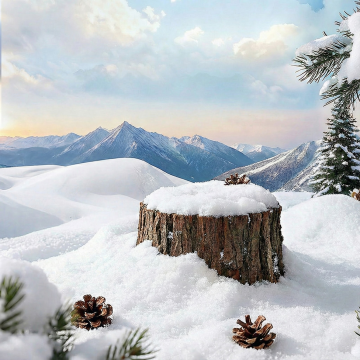 一张具有超写实摄影风格的冬季雪景城市海报,画面主体为近景细腻的白雪覆盖的地面,雪的质感呈现出蓬松、带有细微冰晶反光的特征,阳光从画面上方柔和洒下,形成明亮的高光区域和淡淡的蓝色阴影,营造出清冷而宁静的氛围。远景是被白雪覆盖的连绵山脉轮廓,天空呈现出清澈的浅蓝色并带有少量白色云彩。在保持整体色调(以纯净的白色和浅蓝色为主)和光影效果(柔和顶光、清晰的明暗过渡)的基础上,融入城市元素:画面中景处有被积雪覆盖的现代城市建筑群剪影,屋顶和建筑边缘堆积着厚实的白雪,部分建筑窗户透出温暖的黄色灯光,与冷色调的雪景形成对比。同时,天空中飘洒着轻盈的雪花,雪花形态清晰可见,部分雪花落在前景的雪地上和建筑上,增强冬季氛围。整体构图采用近实远虚的景深效果,视觉焦点集中在前景的雪地纹理和中景的城市建筑轮廓上,传达出冬日城市的静谧与祥和之美,信息传达简洁明了,符合冬季主题宣传的设计感。