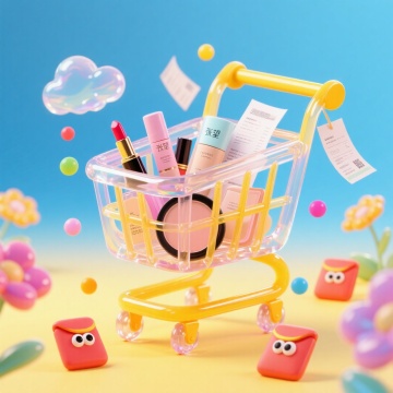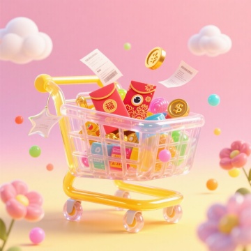 软3D风购物车满载时尚单品,充气质感搭配缤纷彩带与折扣标签,营造可爱又吸睛的促销氛围,适合双11节日营销场景。