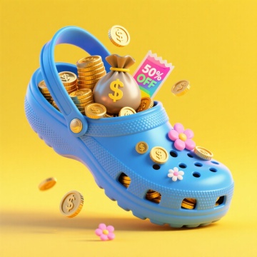 软3D风蓝色洞洞鞋满载金币与优惠券,搭配粉色小花点缀,卡通感十足,营造出可爱又吸睛的促销氛围。