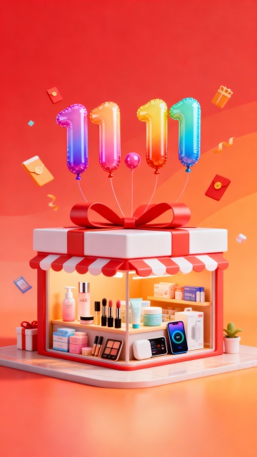 软3D风+波普艺术,梦幻粉蓝城市背景,透明礼盒盛满可乐薯条冰淇淋,金币糖果飘散,喜庆可爱,11.11购物狂欢氛围拉满。