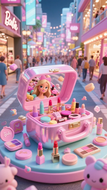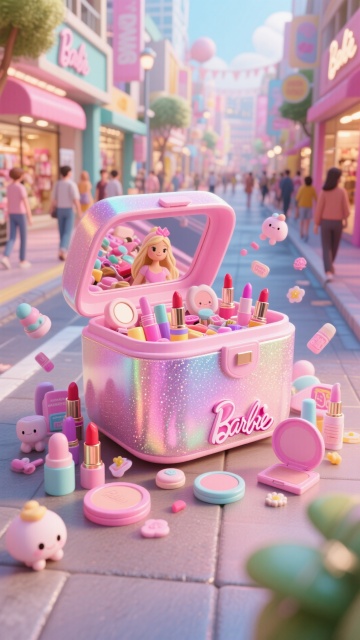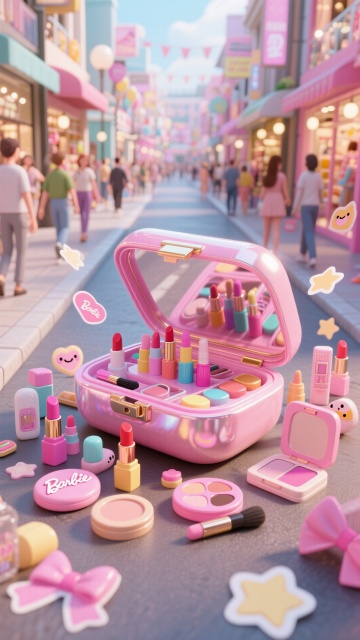 街道上巨大芭比风化妆盒,里面和周围装满并环绕各类可爱商品(美容美妆品),周围有漂浮的商品与小装饰元素,背景是商场购物街