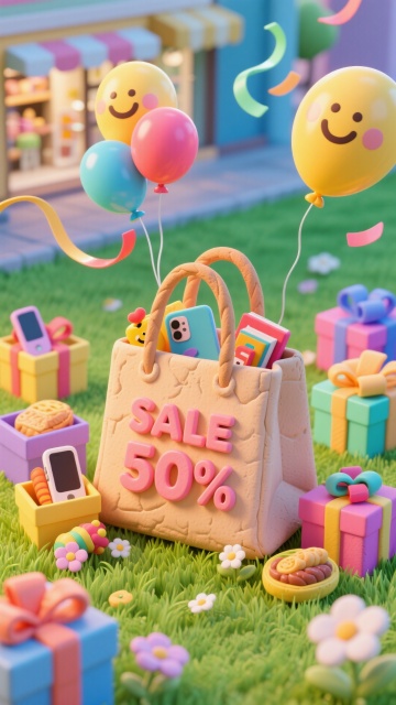 梦幻3D微缩艺术风,黄色购物袋化作店铺,雪夜中绽放温馨喜庆,软塑料质感与彩礼盒交织,萌趣可爱,节日氛围满分。