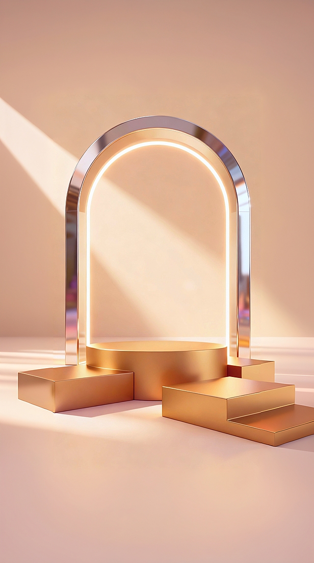 极简主义展台设计,采用低饱和度的米色和柔和金色为主色调,圆形展台台面呈现光滑的金属质感,表面有细腻的光影反射,背景为模糊的暖色调光斑,光线从上方斜射下来在台面上形成自然的明暗过渡和柔和阴影,整体氛围优雅、简约且具有高级感,没有任何多余的装饰元素,突出展台本身的形态美和材质感。详情