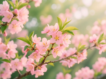 超写实摄影风格,成熟饱满的红色樱桃挂满枝头,翠绿带锯齿边缘的叶片与果实交错,画面整体采用柔和的自然光,背景呈现梦幻的光斑虚化效果,改为晴朗无雨的天气条件,樱桃表面干爽光滑,反射着明亮的阳光,叶片舒展挺立,无水滴痕迹,色彩鲜明饱和,构图保持近景特写,突出果实的质感与细节,整体氛围清新明快,展现阳光下樱桃的新鲜诱人。