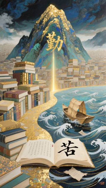 古典中式插画风,鎏金大字“勤”闪耀,书山书海超现实,波涛中帆船寻知,尽显勤苦智慧。