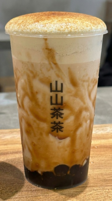特写一杯刚做好的、顶部有芝士奶盖的奶茶,放在浅色橡木桌上,背景虚化中有中国书法画,国潮风格,柔和自然光,杯壁有水珠,色彩鲜明清新,高清细节,小红书流行