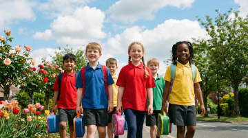 一群国外的青少年在阳光下奔跑,他们笑容灿烂,动作充满活力,穿着休闲运动装,背景是广阔的蓝天白云,画面明亮清新,充满青春气息