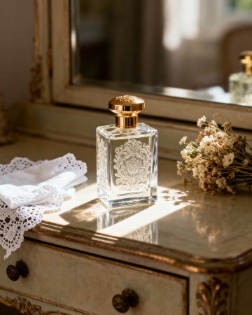 鎏金风与玻璃风交融,金属瓶盖折射柔和光影,干花飘浮于琥珀色背景,营造奢华优雅的唯美感,重拟物手法强化质感与实景感。