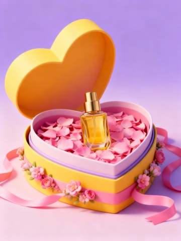 3D轻拟物风格,心形礼盒盛满玫瑰花瓣与香水瓶,柔和粉紫渐变背景,塑料质感与玻璃光泽交织,传递甜蜜浪漫的节日氛围。