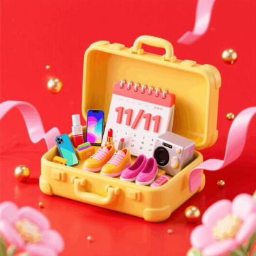 软3D风+粘土质感,卡通化行李箱满载零食与“双11”日历,波普色彩碰撞,萌趣十足,营造可爱喜庆的促销氛围。