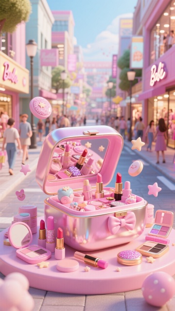 梦幻3D风格的蛋糕店,透明玻璃柜内陈列着精致甜点,顶部草莓蛋糕与霓虹灯招牌营造出甜蜜可爱氛围,粉色心形漂浮其间,清透柔和的光影带来虚拟现实般的梦幻感。