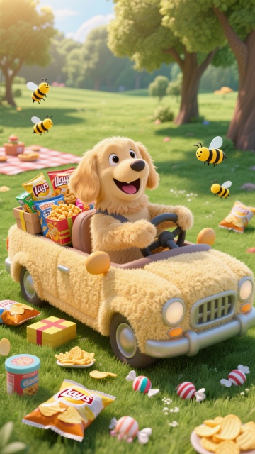 软3D风格的可爱小狗驾驶毛绒小车,拟人化设计充满卡通感与梦幻感,草地野餐场景洋溢温馨趣味,蜜蜂飞舞增添童趣氛围。