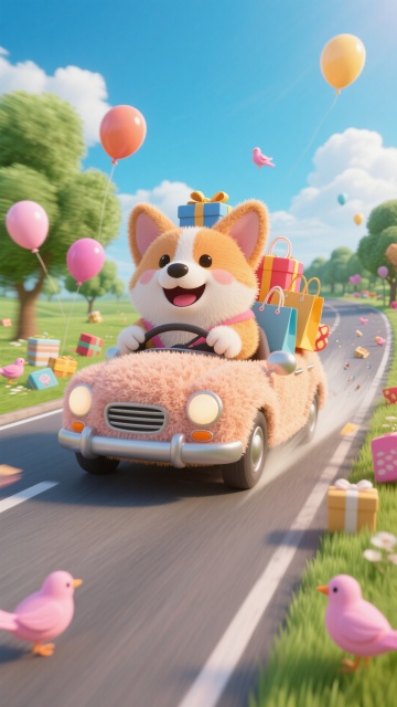 软3D风格的拟人柯基驾驶毛绒小车,满载礼物与气球,穿梭在春日花径,粉色小鸟环绕,梦幻喜庆又清新可爱。