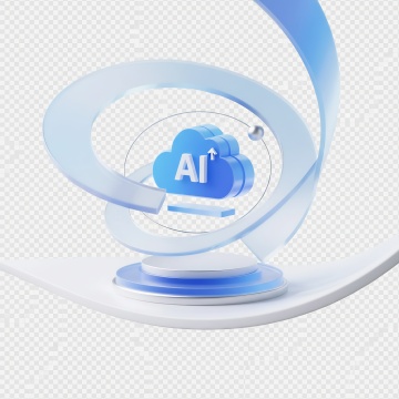不规则轻薄旋涡白蓝青色抽象流动感渐变背景,磨砂玻璃质感,有透明感和光泽感,旋涡中心有个圆形底座,旋涡渐变透明感,逐渐向外扩展并与白色背景完美平滑融入,有运动走势和空间感,光效过渡自然,完整结构,高清质感。底座上有一个蓝色渐变透明材质的多层云服务图标、云服务上有个向上箭头,展台上有数字“AI”、有数字屏幕,围绕一个倾斜细环,细环有一个小球,干净纯白色背景,等轴侧视角,梦幻风格,色彩明亮,3D艺术,blender风格,oc渲染器,减少细节,高分辨率,用途UI设计背景图,类型数字艺术作品
