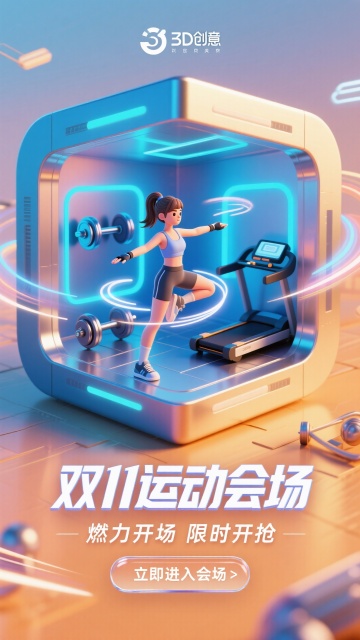 未来感与科技感交融的3D卡通风格,软3D毛发生长风营造绒毛质感,霓虹灯效点亮虚拟现实运动场,双11燃力开场,酷炫吸睛。