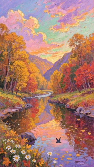 油画风秋日溪景,厚涂笔触营造静谧唯美感,光影交织于落叶与水面,印象画派手法展现文艺意境。