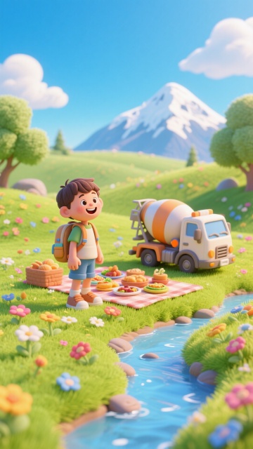 软3D风卡通场景,可爱男孩野餐,粘土质感与梦幻自然融合,清新明媚,虚拟现实感十足,传递春日欢乐氛围。