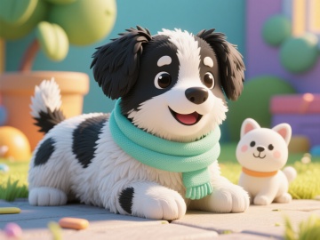 软3D粘土风,萌趣小狗戴围巾,温馨卡通场景,充满可爱与趣味感,适合节日氛围。