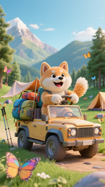 软3D风拟人柴犬驾驶越野车,置身梦幻自然营地,带着露营装备,蝴蝶翩跹,清新治愈,充满童趣与冒险感。