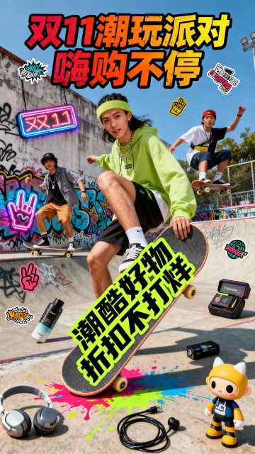 涂鸦风街头场景,霓虹灯与大字风标语碰撞,潮酷人物滑板姿态动感十足,波普艺术拼贴元素融合潮流单品,营造双11酷炫促销氛围。