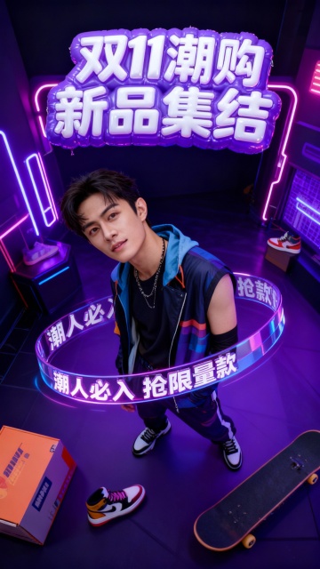 赛博朋克风霓虹灯场景,充气字效搭配虚拟现实元素,潮流青年演绎未来感穿搭,双11促销氛围拉满,酷炫科技感十足。